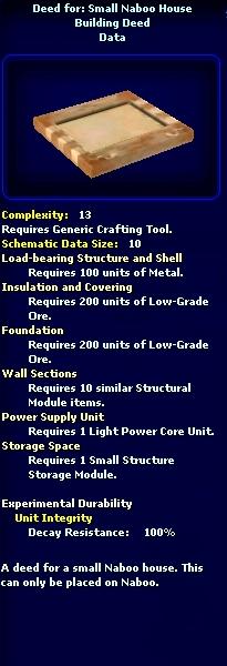 | 15:27, 17 January 2010 | SmallNabooHouseSWGC.jpg (file) | 143 KB | {{PageHeader|Image|Deed for: Small Naboo House}} == description == Deed for: Small Naboo House == source == www.swgcraft.com via wayback.org == author == Unknown == permission == {{Non-free game screenshot}} Category:Architect | 1 | |