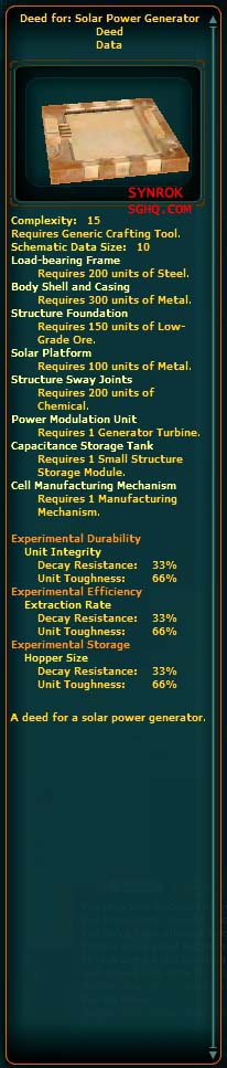 | 16:11, 17 January 2010 | SolarPowerGeneratorSchem.jpg (file) | 51 KB | {{PageHeader|Image|Deed for: Solar Power Generator}} == description == Deed for: Solar Power Generator == source == swg.allakhazam.com == author == Unknown == permission == {{Non-free game screenshot}} Category:Architect | 1 | |
