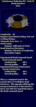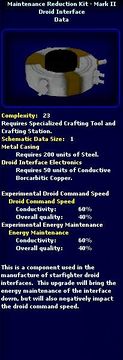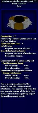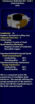 | 04:59, 2 June 2008 | Maintenance Reduction Kit - Mark I - Schematic.jpg (file) | 31 KB | {{PageHeader|Image|ImageName}} == description == Image Description == source == http://swg.allakhazam.com == author == == permission == {{Non-free game screenshot}} Category:Shipwright | 1 | |